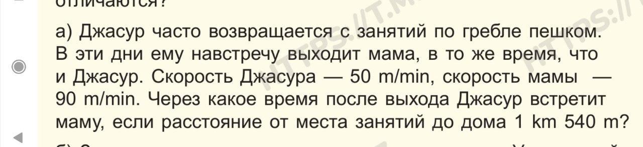 а) Джасур часто возвращается с занятий по гребле пешком. В эти дни ему навстречу выходит мама, в то же время, что и Джасур. Скорость Джасура - 50m / min , скорость мамы 90m / min . Через какое время после выхода Джасур встретит маму, если расстояние от места занятий до дома 1 km 540 m?