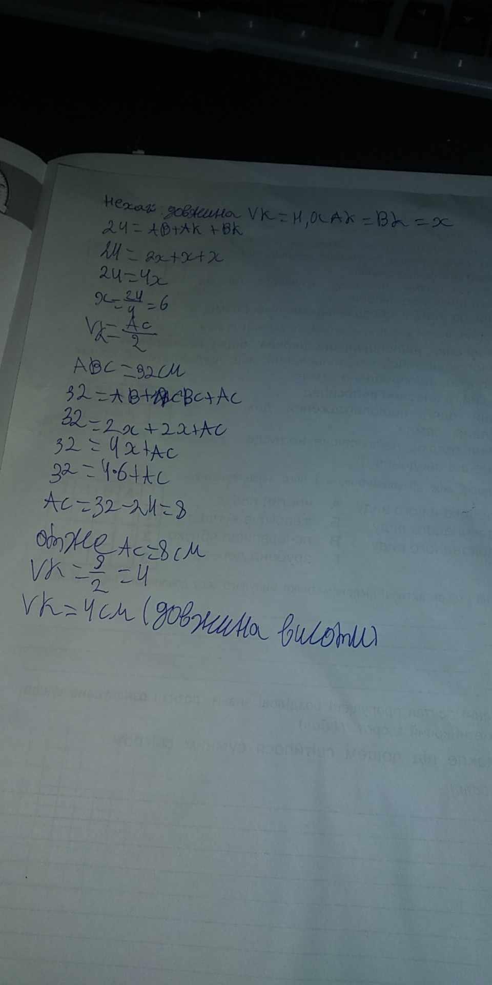 У рівнобедреному трикутнику АВС з основою АС проведено висоту ВК. знайдіть довжину висоти ВК, якщо периметр трикутника АВК дорівнює 24 см, а периметр трикутника АВС — 32 см.