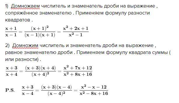 2) Домножим числитель и знаменатель дроби на выражение , равное знаменателю дроби . Применяем формулу квадрата суммы ( или разности) .