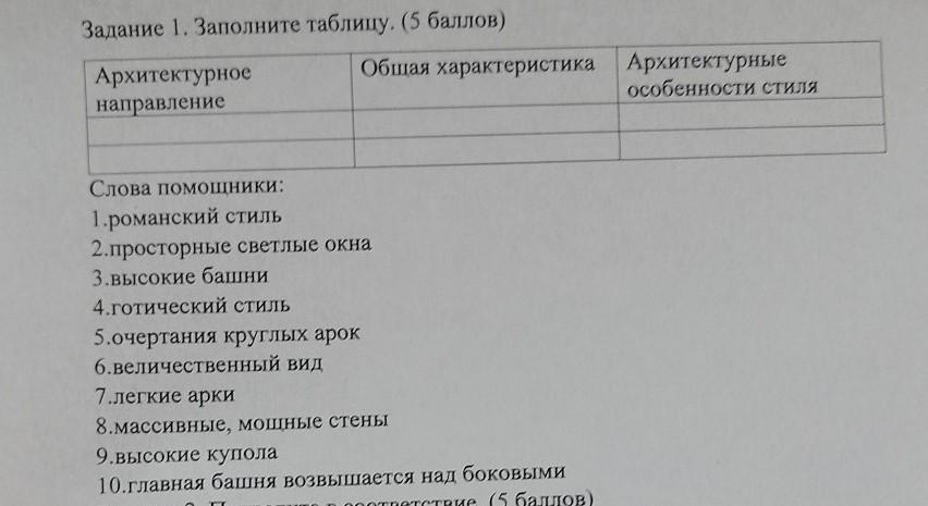 50 баллов даю пж срочно Задание 1. Заполните таблицу. (5 баллов) Архитектурное направление Общая характеристика Слова помощники: 1.романский стиль 2.просторные светлые окна 3.высокие башни 4.готический стиль 5.очертания круглых арок 6.Величественный вид 7.легкие арки 8.массивные, мощные стены 9.высокие купола 10.главная башня возвышается над боковыми