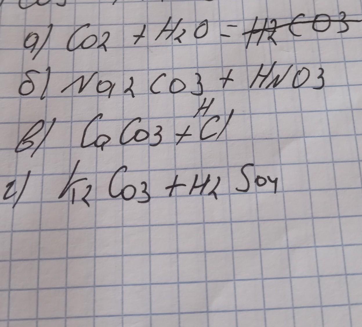 б)Na2CO3+HNO3=NaNO3+H2O+CO2⬆️