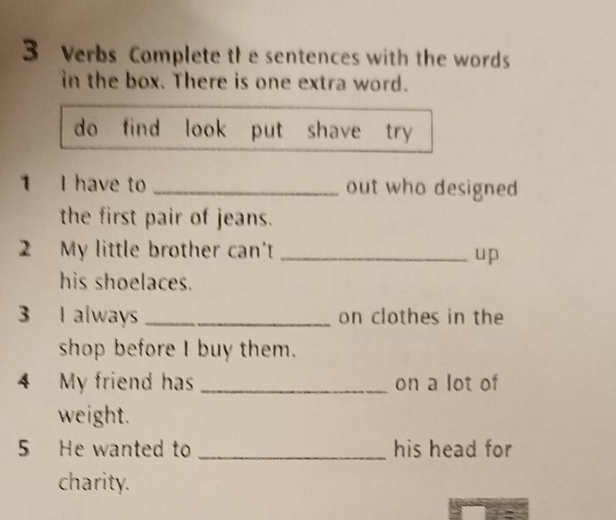 1 I have to the first pair of jeans. 2 My little brother can't his shoelaces. 3 I always shop before I buy them. 4 My friend has weight. He wanted to charity. 5 out who designed - up on clothes in the on a lot of his head fo СРОЧНООr