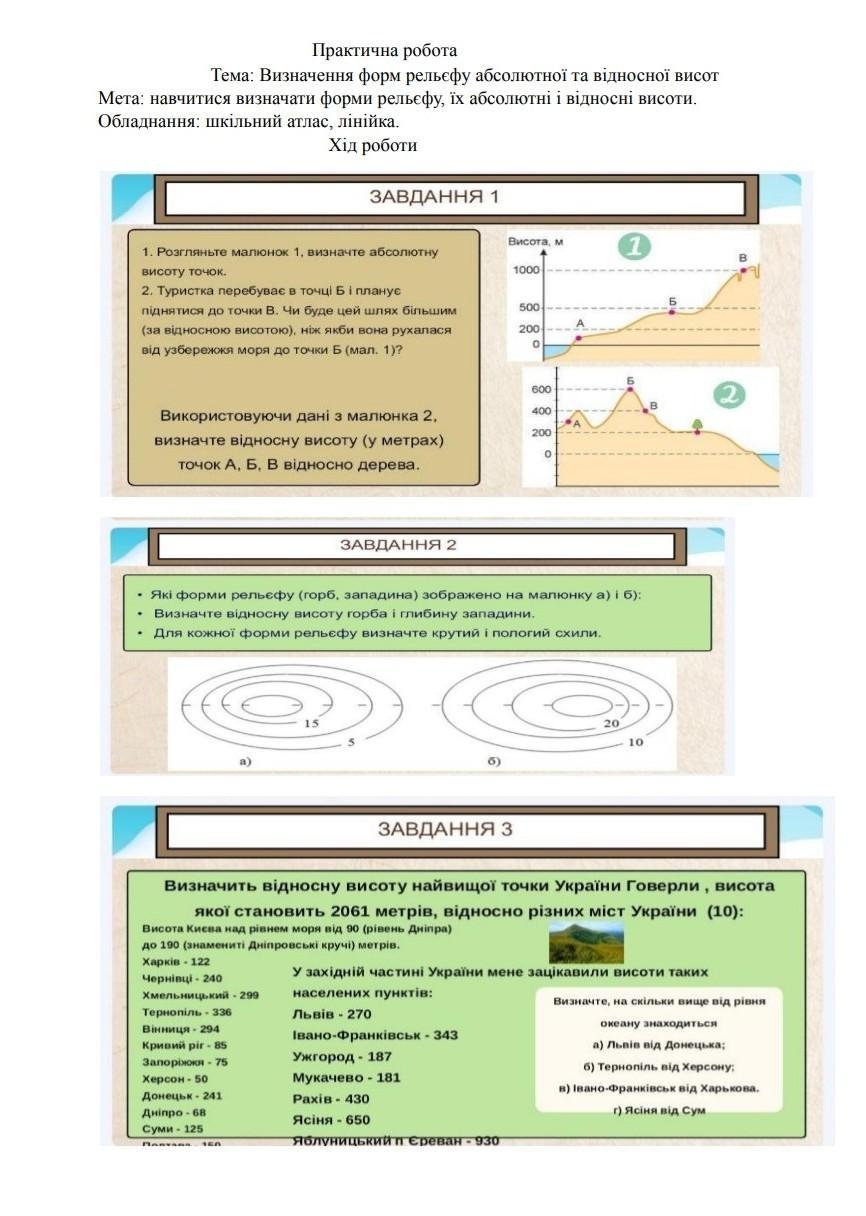 Ответ:1: завдання пишемо точка а 100 м над рівнем моря нижче пишемо точка в 450 м над рівнем моря нижче пишемо точка в 1000 м над рівнем моря 2: завдання пишемо відносна висота точки А і Б 350 м нижче відносна висота точки BB 550 м нижче шлях б в більший за відносною висотою нижче пишемо точка b 400 м відносної висоти нижче пишемо точка а 100 м відносної висоти нижче пишемо точка в 200 м відносної висоти 3: завдання Харків 2061- 122 = 1933 м Чернігів ці дорівнює 261-240 = 1821 м Хмельницький дорівнює 1762 м Тернопіль 1725 м Вінниця 1767 м Кривий Ріг дорівнює 1976 м Запоріжжя дорівнює 1986 м Херсон 211 м Донецьк 1820 м Дніпро 1993 м Суми 1936 м Полтава 1911 м Чернігів 1944 м
