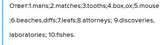 :1.mans;2.matches;3.tooths;4.box,ox;5.mouse;6.beaches,diffs;7.leafs;8.attorneys; 9.discoveries, laboratories; 10.fishes.