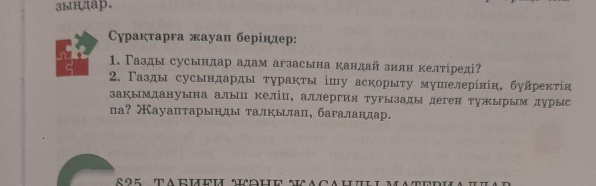 1. Газды сусындар адам ағзасына қандай зиян келтіреді? 2. Газды сусындарды тұрақты ішу асқорыту мүшелерінің, бүйре зақымдануына алып келіп, аллергия туғызады деген тұжырым ду па? Жауаптарыңды талқылап, бағалаңдар.