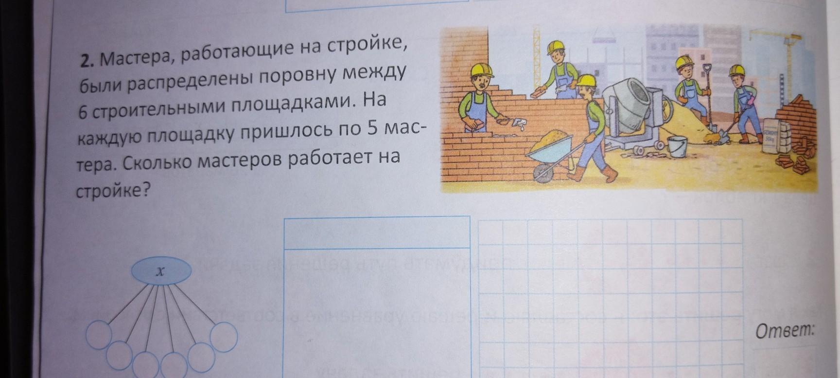 2. Мастера, работающие на стройке, были распределены поровну между 6 строительными площадками. На каждую площадку пришлось по 5 мас- тера. Сколько мастеров работает на стройке?