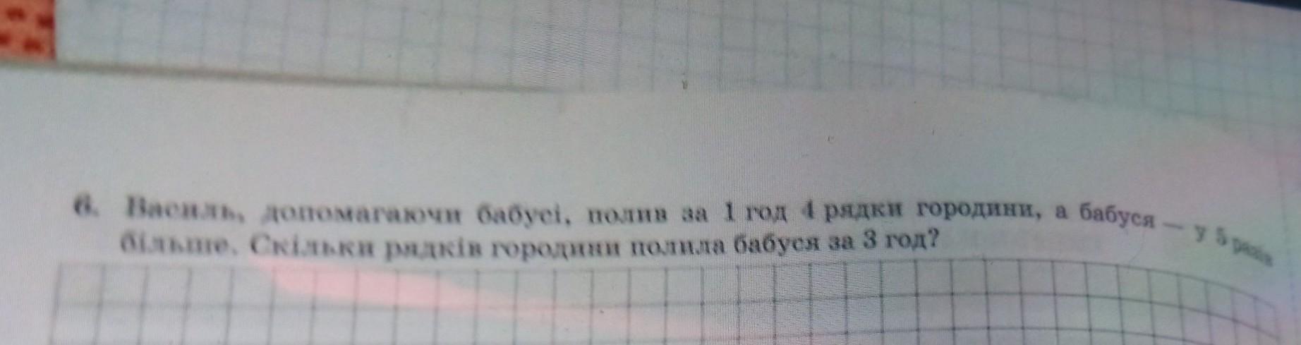 Василь допомагає бабусі полив за одну годину чотири рядки городини а бабуся у п'ять разів більше скільки городини палила бабуся за три години