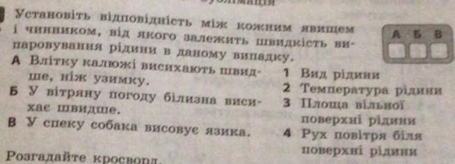 Установіть відповідність між кожним явищем 1 чинником, від якого залежить швидкiсть ви- паровування рідини в даному випадку, А Влітку калюжі висихають швид ше, ніж узимку. Б у вітряну погоду білизна виси- хае швидше. в у спеку собака висовує язика. Poare rom 1 Вид рiдини 2 Температура рідини 3 Площа вільної поверхнi рiдини 4 Рух повітря біля поверхні рідини