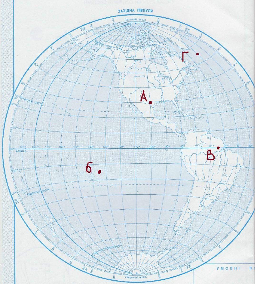 Визначити координати (широту і довготу) УСІХ ТОЧОК !!! ВОНИ НА ФОТО ( зайдіть в профіль там є друга півкуля ! )