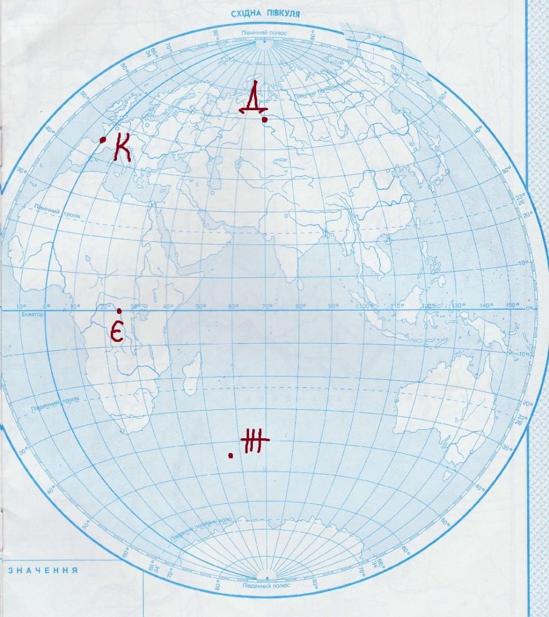 Визначити координати (широту і довготу) УСІХ ТОЧОК !!! ВОНИ НА ФОТО ( В профілі є друга півкуля !!!)