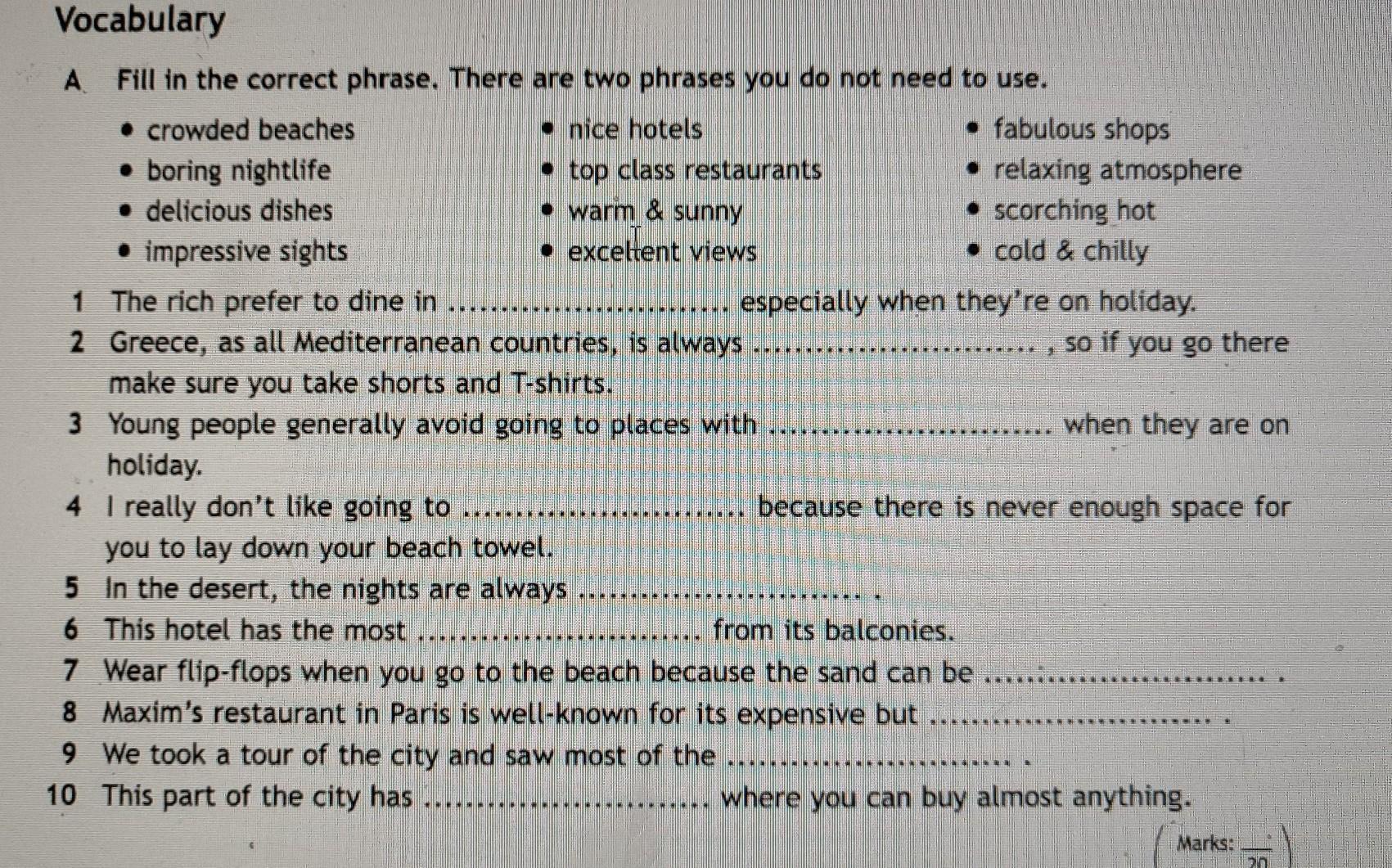 Ответ:1)excellent wievws2)sunny 3)nice hotels 4)crowded beaches 5) relaxing atmosphr пока что это нашел пото еще дам