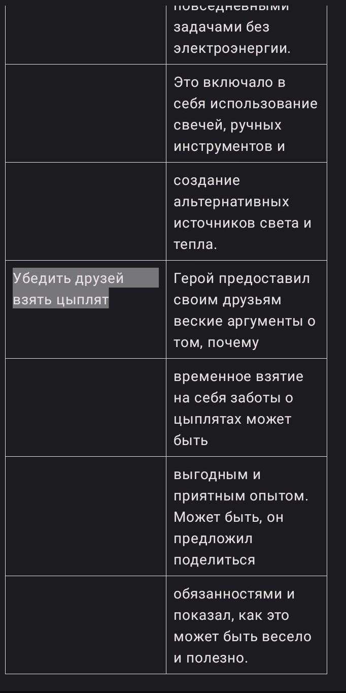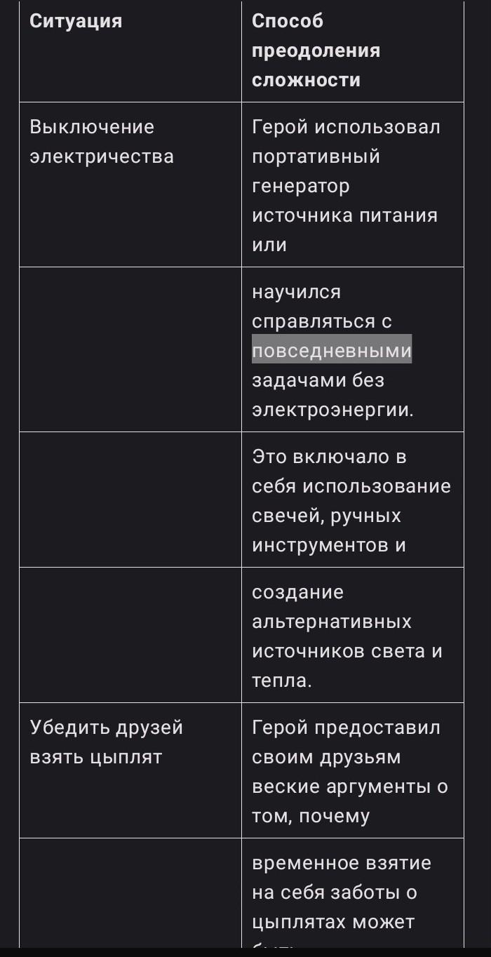 с помощью вспомогательной таблицы расскажите как справлялся со сложностью гл герой: выключение электричества , убедить друзей взять на время всех его цыплят