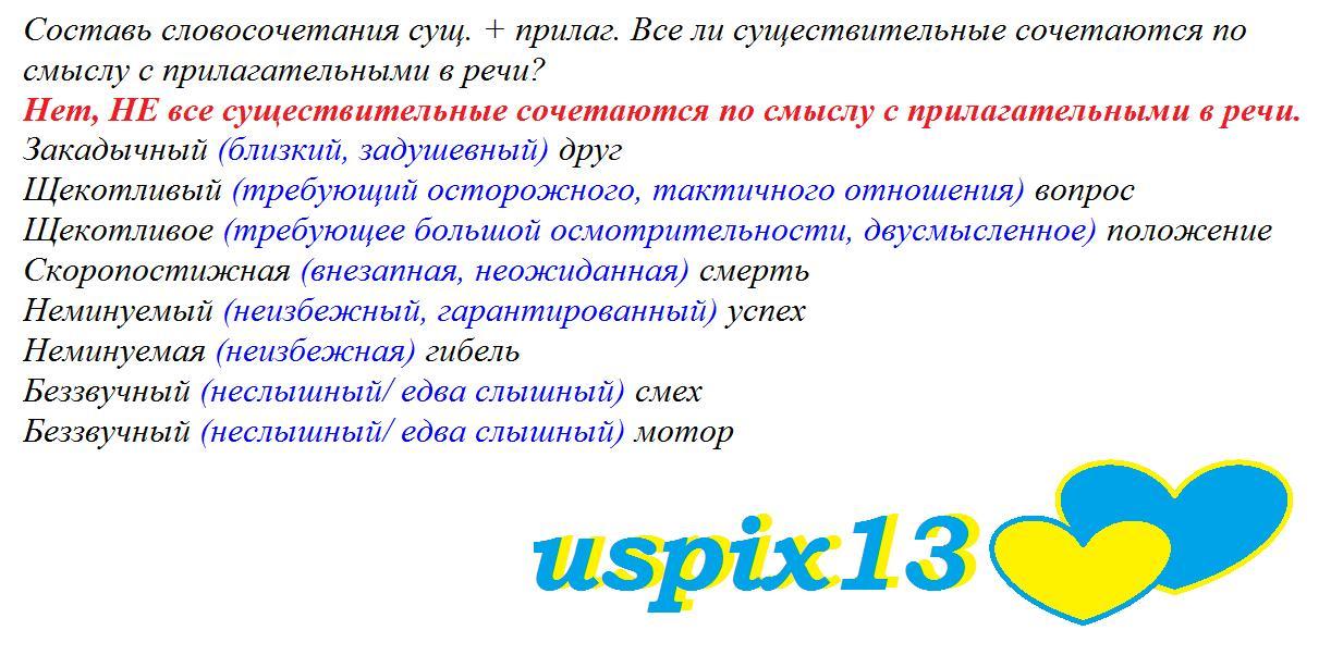 ❗СРОЧНО ❗ дам 30 баллов 9. Составь словосочетания сущ. + прилаг. Все ли существительные сочетаются по смыслу с прилагательными в речи? Закадычный (друг, сосед) Щекотливый (вопрос, положение, мысль) Скоропостижный (смерть, победа, встреча) Неминуемый (успех, гибель, жизнь) Беззвучный (ученик, смех, весна, мотор)