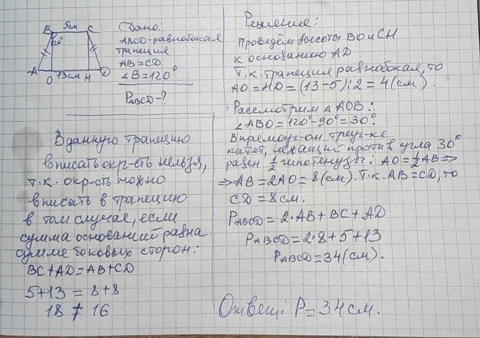 У рівнобічній трапеції з тупим кутом 120° основи дорівнюють 5 см і 13 см. Знайди периметр трапеції. Чи можна в цю трапецію вписати коло? Срочно пж даю 40 балов