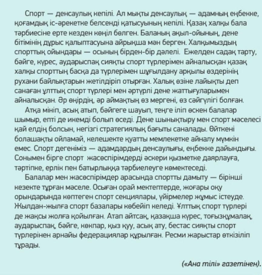 -Спорт-денсаулық кепілі.Мен шынықтырып,еңбек етсем денемді жақсы формада сақтаймын.Және де денсаулығымды. Бұл өте маңызды.