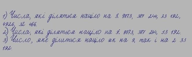 3 чисел 9873, 5685, 387 244, 33 192, 4926, 47.295, 32 466 випишіть ті, які діляться націло: 1) на 3; 2) на 9; 3) на 9 і на 2. ДОПОМОЖІТЬ БУДЬ ЛАСКА!!!