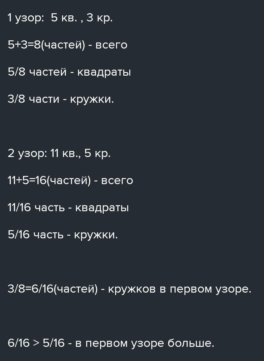 Рахиля нарисовала 2 узора из квадратов и кругов. В первом узоре 5 квадратов и 3 круга, во втором 11 квадратов и 5 кругов.Запишите в виде дроби части узоров, нарисованных кружками, и сравните их.