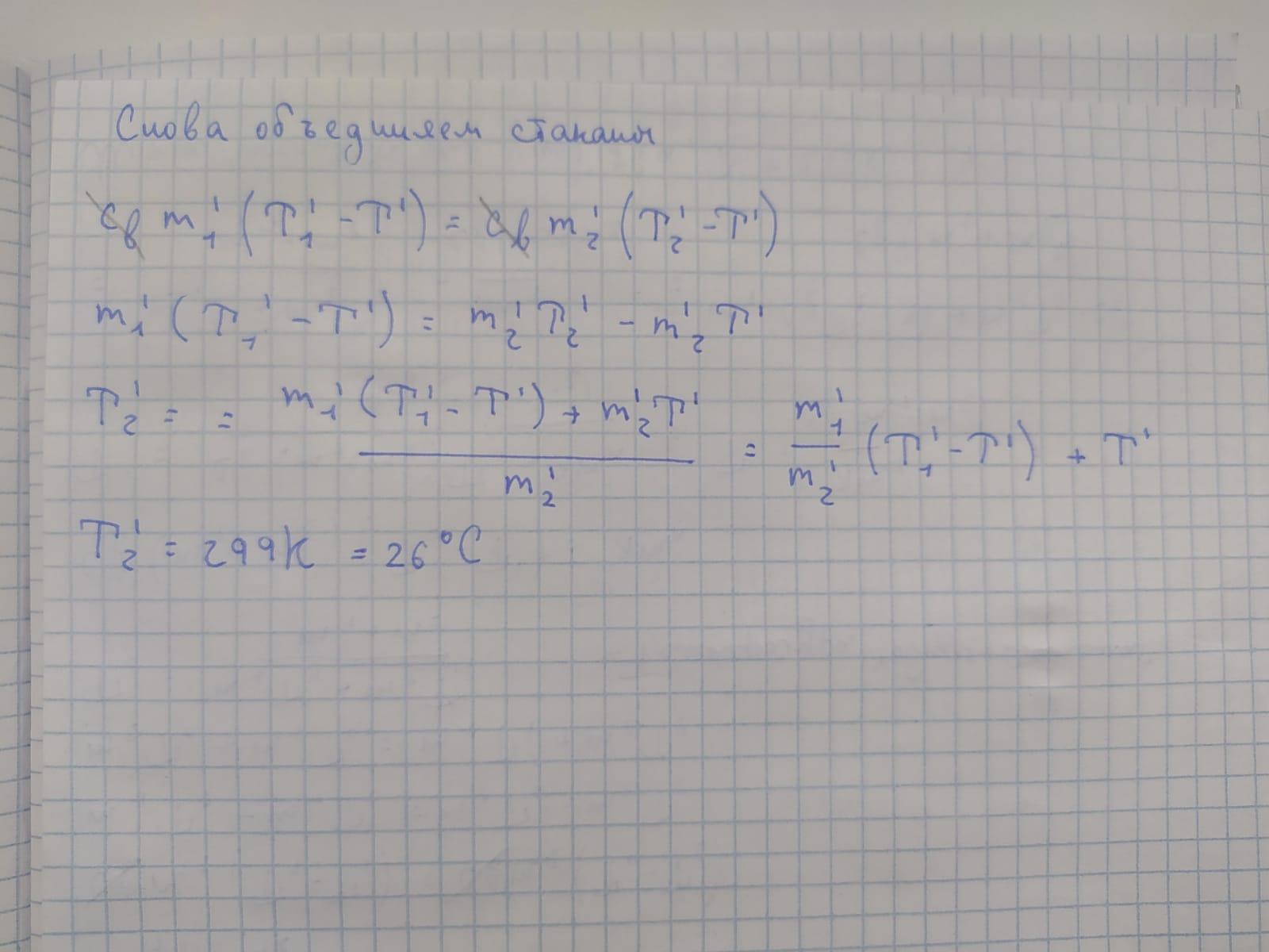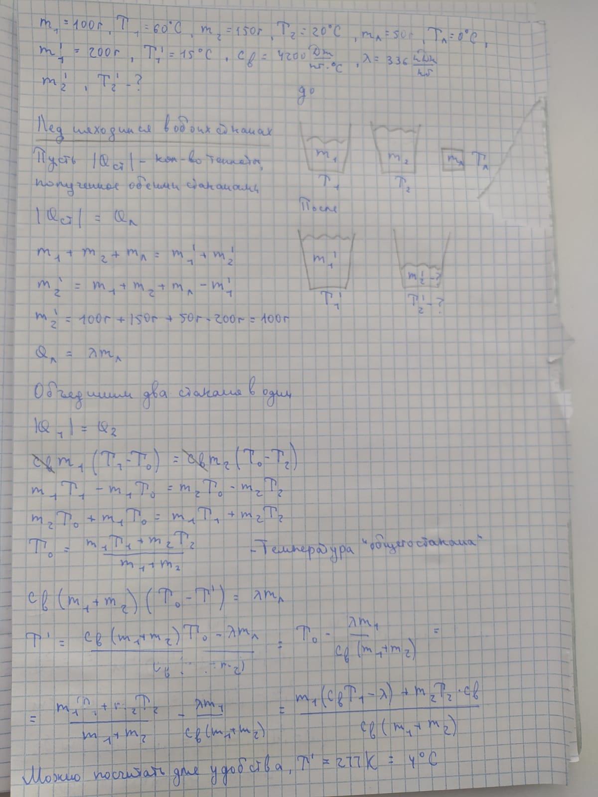 У фокусника есть два легких стакана с водой и кусочек льда. В первый стакан налито 100 г горячей воды с температурой 60°С, во второй 150 г холодной воды с температурой 20°С. Лёд имеет температуру 0°С и массу 50 г. Фокусник сначала опускает лёд в стакан с холодной водой, затем несколько раз переливает содержимое из одного стакана в другой. В итоге в первом стакане оказалось 200 г воды с температурой 15°С. Сколько воды и с какой температурой находится во втором стакане? Известно, что содержимое каждого стакана находится в состоянии теплового равновесия, вода в процессе переливаний не проливалась, а теплоемкостью стаканов и теплопотерями можно пренебречь. Удельная теплоемкость воды cв = 4200 Дж/кг·°C, теплота плавления льда λ = 336 кДж/кг.
