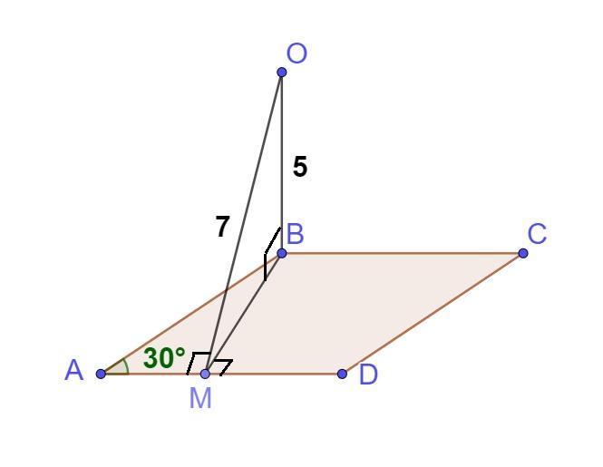 Острый угол ABCD равен 30°. Через вершину B тупого угла проведён отрезок OB, перпендикулярный плоскости ромба ABCD. Найдите площадь ромба ABCD, если OB=5 и расстояние от точки O до стороны AD ромба равно 7.