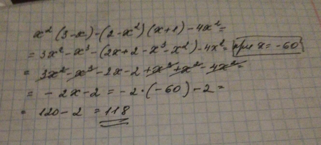 x ^ 2 * (3 - x) - (2 - x ^ 2)(x + 1) - 4x ^ 2 і знайдіть його значення, якщо x = - 60