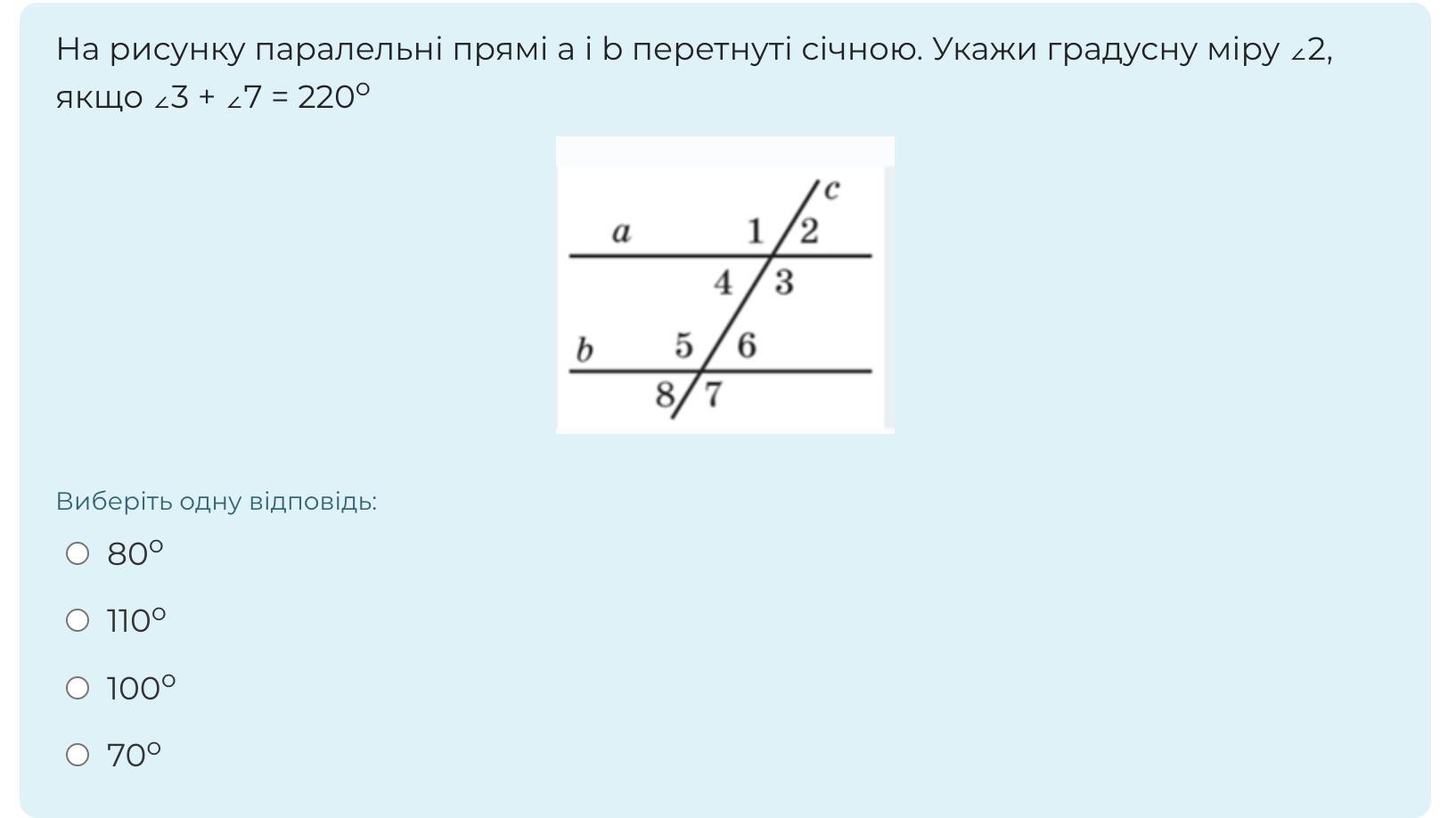 він буде дорівнювати 110°(бо кут 3 дорівнює куту 7)