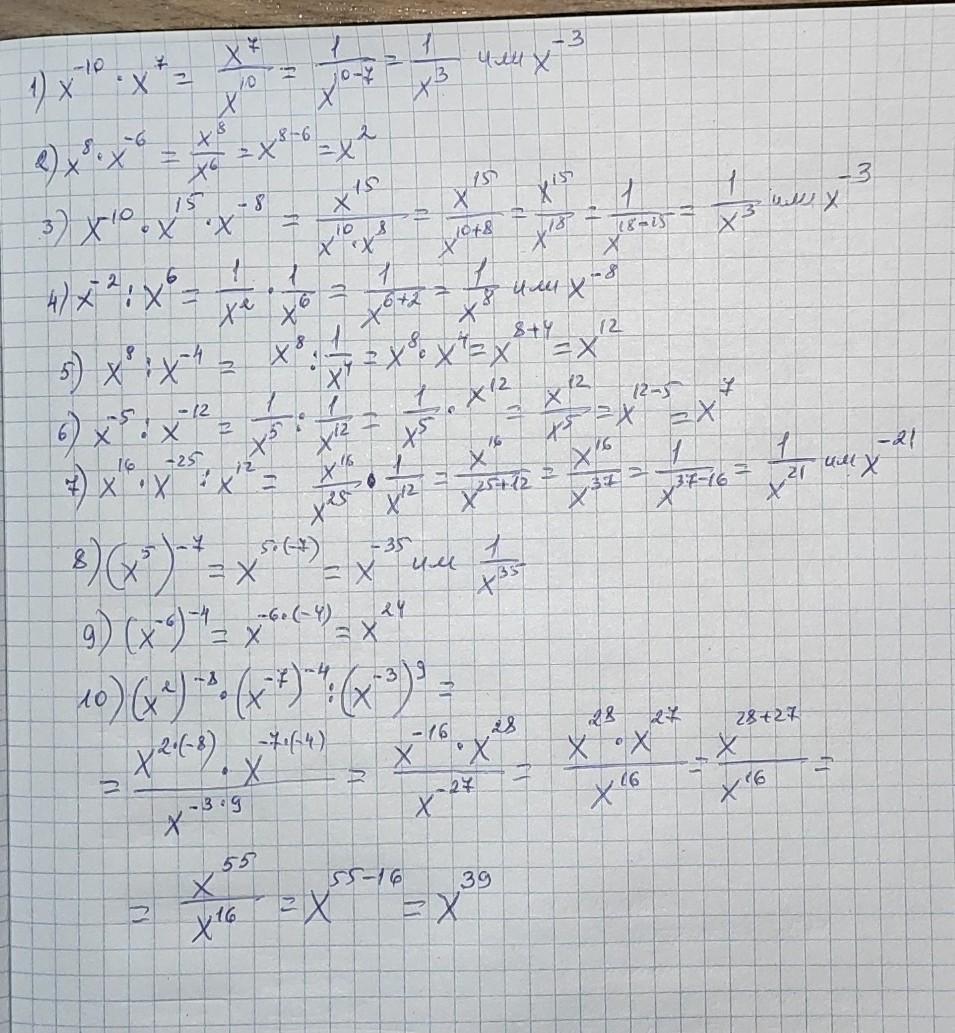 10) (x^2)^-8 × (x^-7)^-4 : (x^-3)^9 = x^-16 × x^28 : x^-27 = x^-15