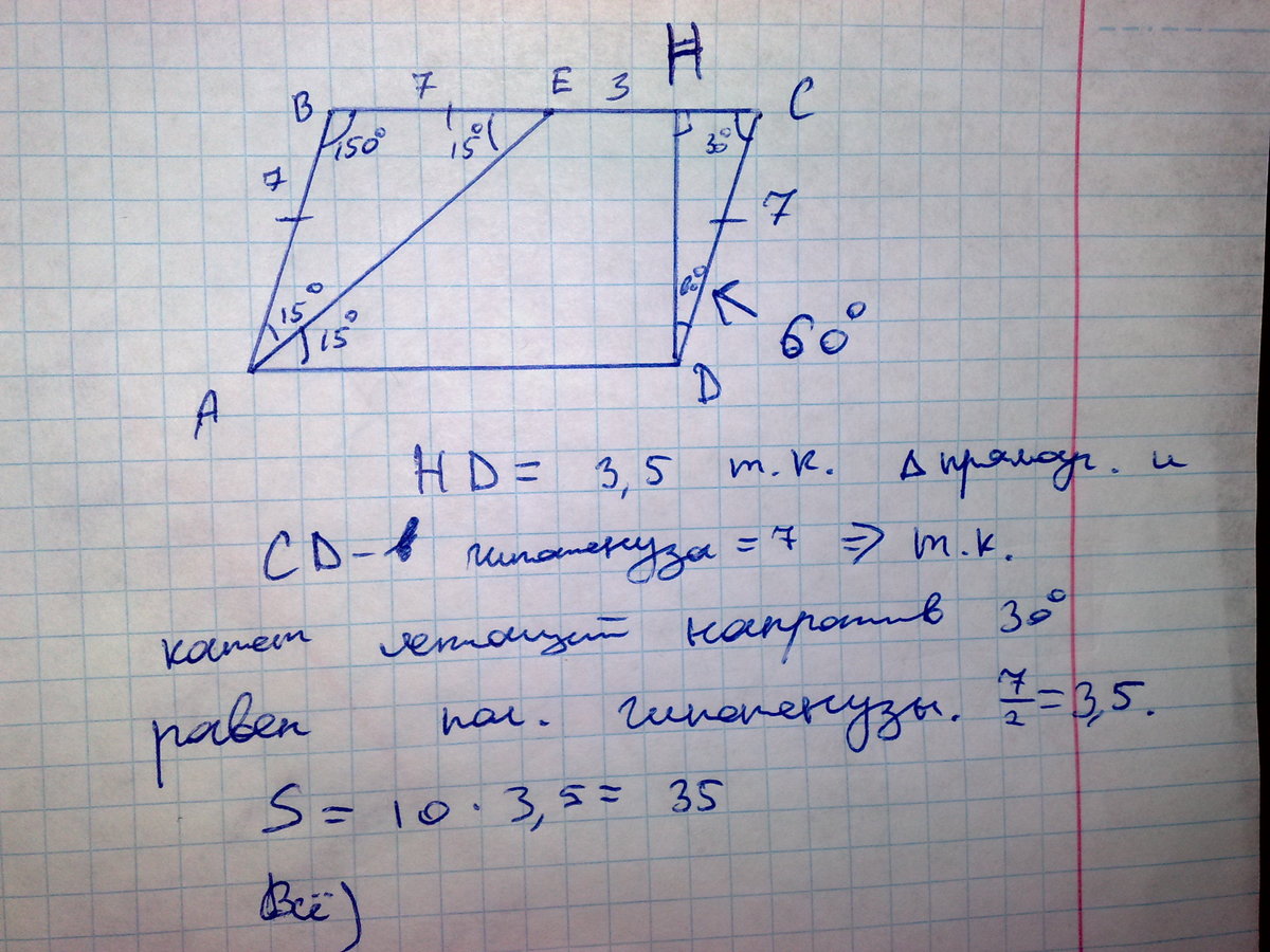 S=основание на высоту . Далее находим высоту BE + EC = 7 + 3 = 10. Далее находим высоту. Проводим высоту DH. Далее на фотке