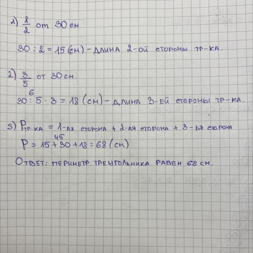 длина первой стороны треугольника 30см, длина второй стороны 1/2 длины первой стороны, а длина третьей - 3/5 длины первой стороны. Найди периметр треугольника?