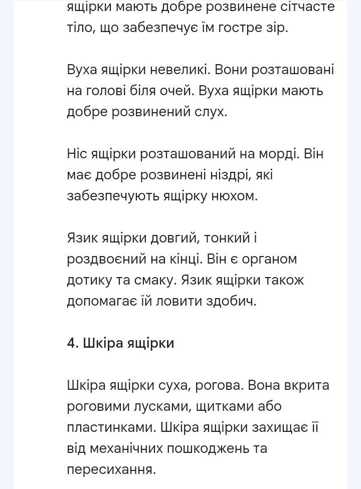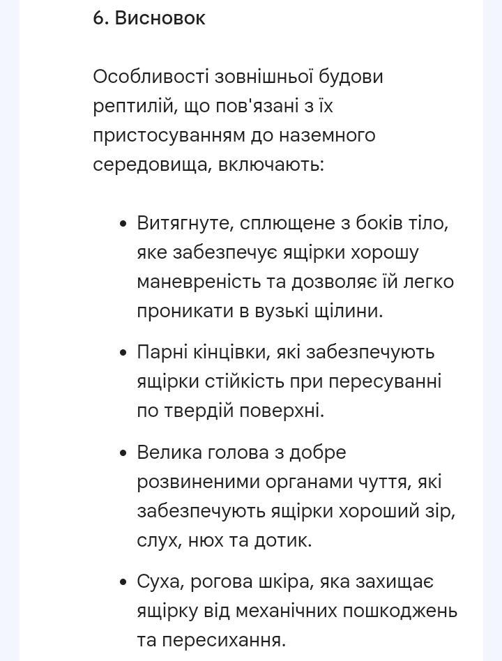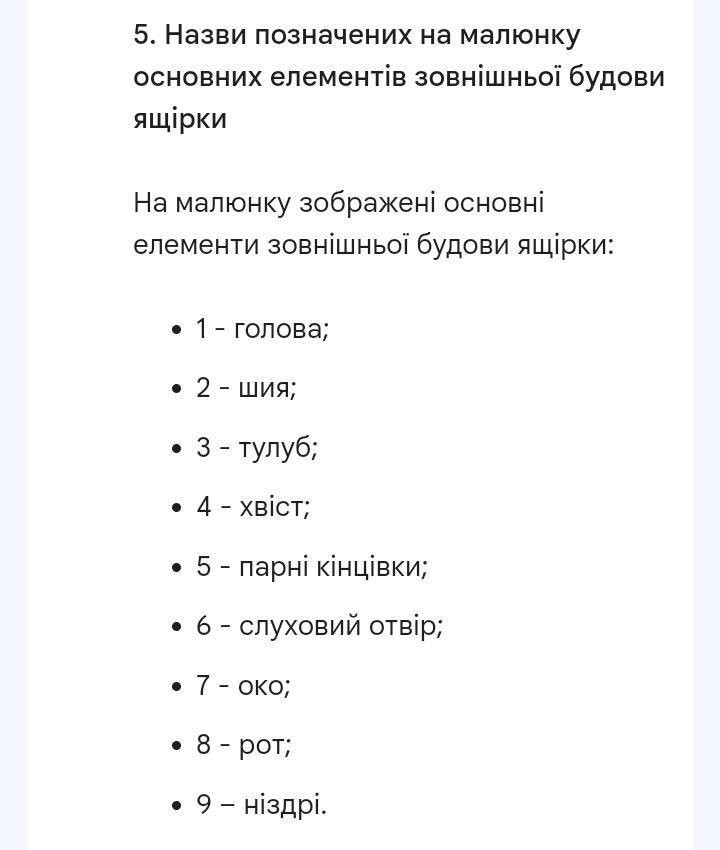 1. Розгляньте зовнішній вигляд ящірки. Визначте форму та відділи тіла. Яке значення для ящірки має така зовнішня будова тіла? 2. Розгляньте кінцівки ящірки. Яку будову й розташування ма- ють кінцівки? 3. Дослідіть органи чуття ящірки. Які особливості органів чуття в рептилій, 4. Зверніть увагу на шкіру ящір- ки. Які особливості та значення шкіри для рептилій? 5. Визначте назви позначених на малюнку основних елементів зовнішньої будови ящірки. 6. Сформулюйте висновок, у якому обґрунтуйте особливості зовнішньої будови рептилій, що позв'язані з їх пристосуванням до наземного середовища. 30 баллов