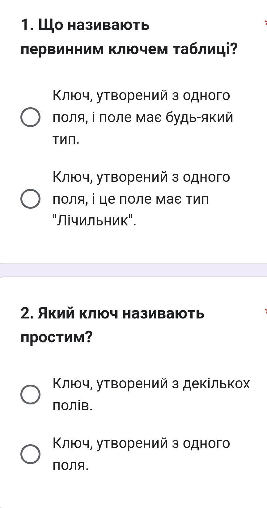 1.Ключ утворений з одного поля, і це має тип "Лічільник".
