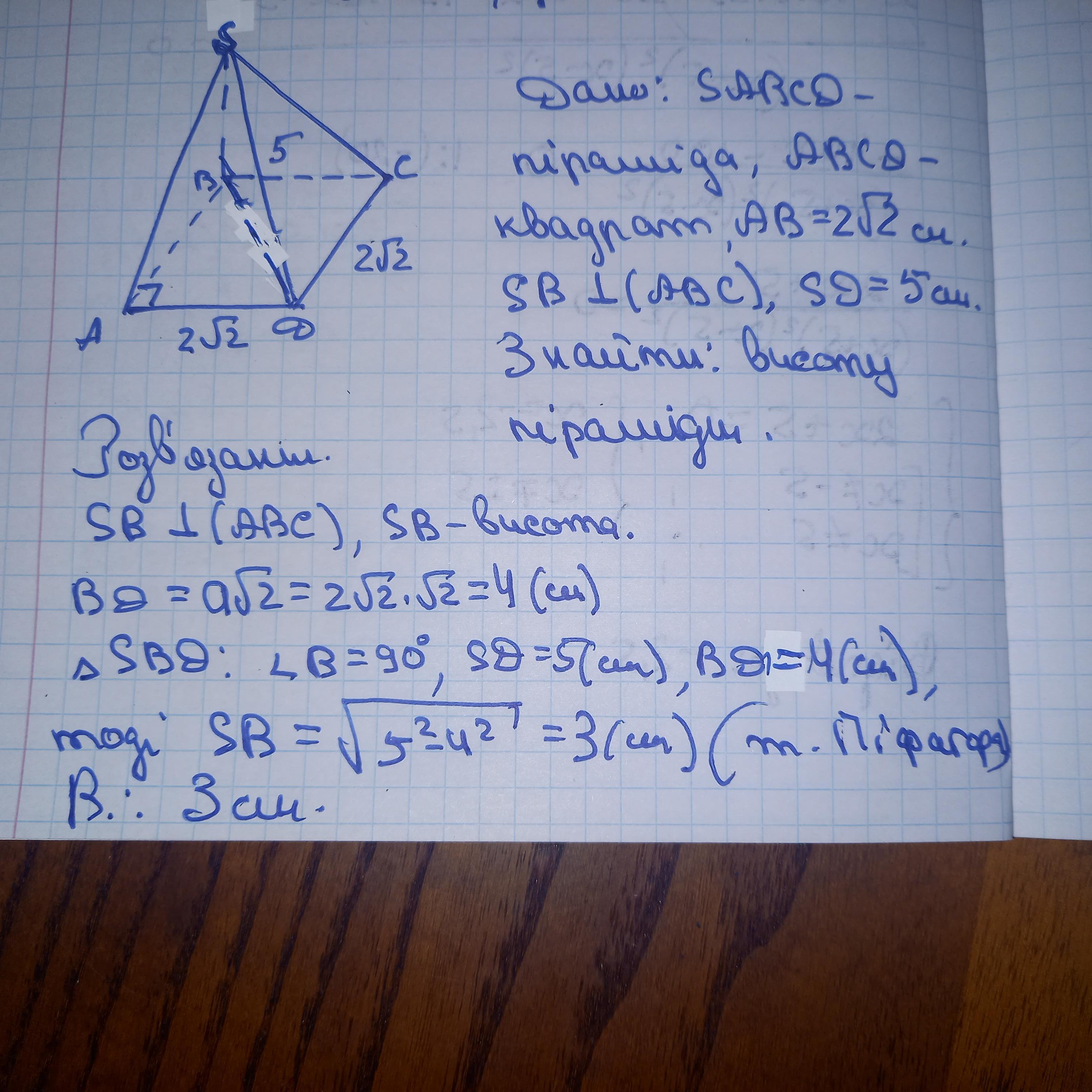 Основою піраміди є квадрат зі стороною 2√2 см. Одне з бічних ребер піраміди перпендикулярне до площини основи, а найбільше бічне ребро піраміди дорівнює 5 см. 1. Знайдіть (у см) висоту піраміди.