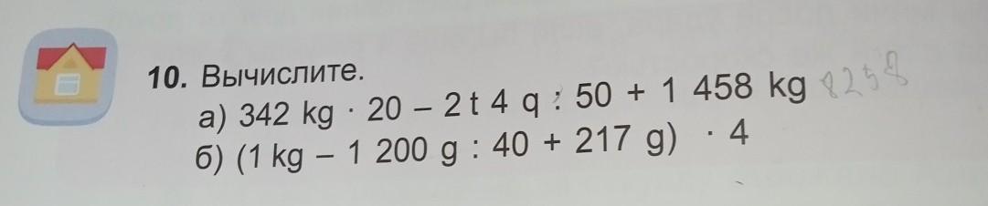 10. Вычислите. a) 342 kg · 20 - 2 t 4 q : 50 + 1 458 kg 12: б) (1 kg – 1 200 g : 40 + 217 g) · 4