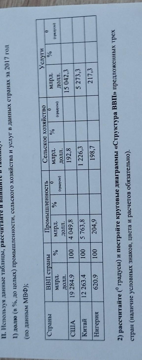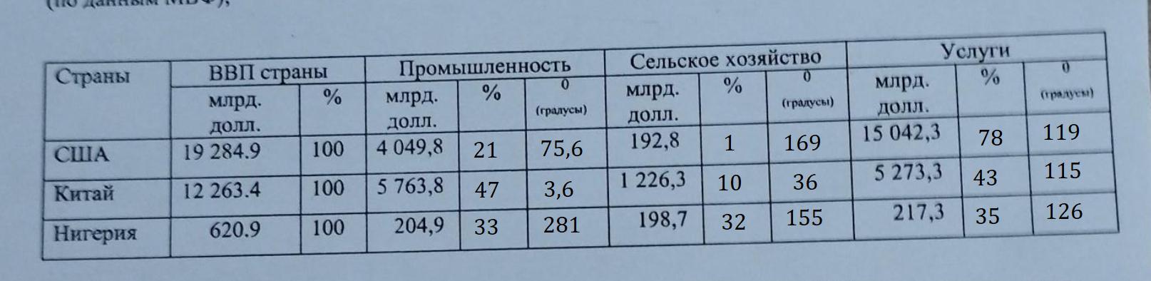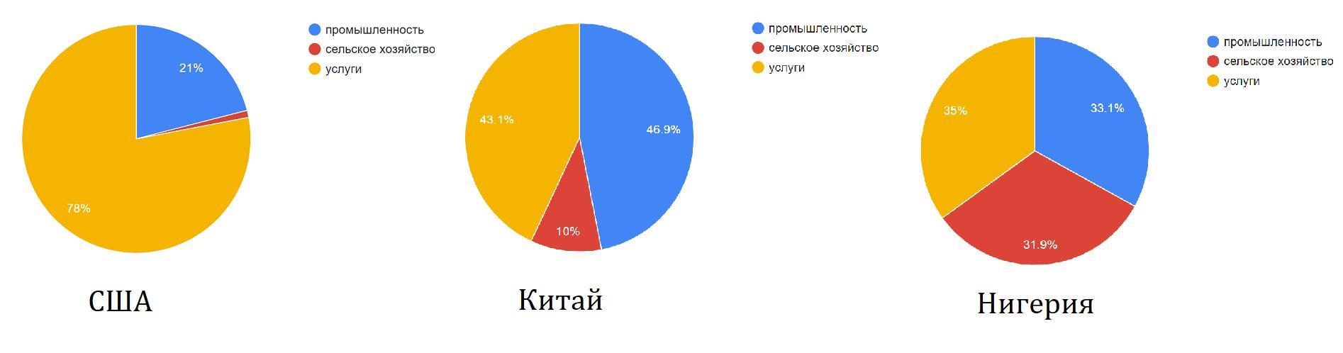 - Используя данные таблицы мы рассчитали и вписали в таблицу долю промышленности, сельского хозяйства и услуг в США, Китае и Нигерии.