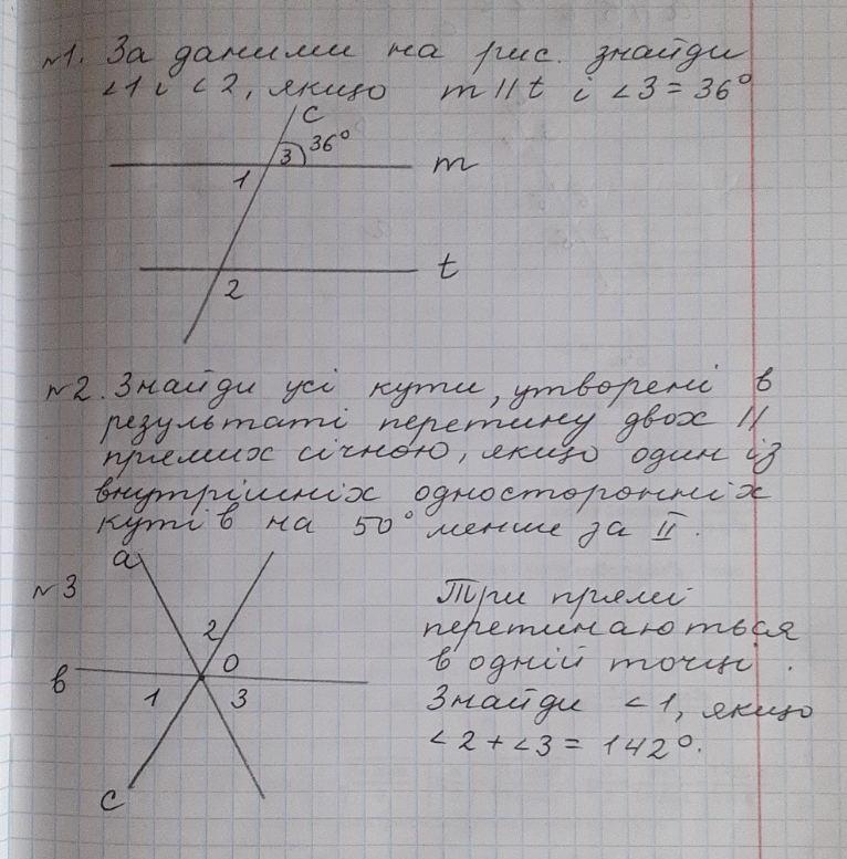 3. ∠2+∠3=142°, тоді ∠О=180-142=38°; ∠1=∠О=38° за властивістю вертикальних кутів.