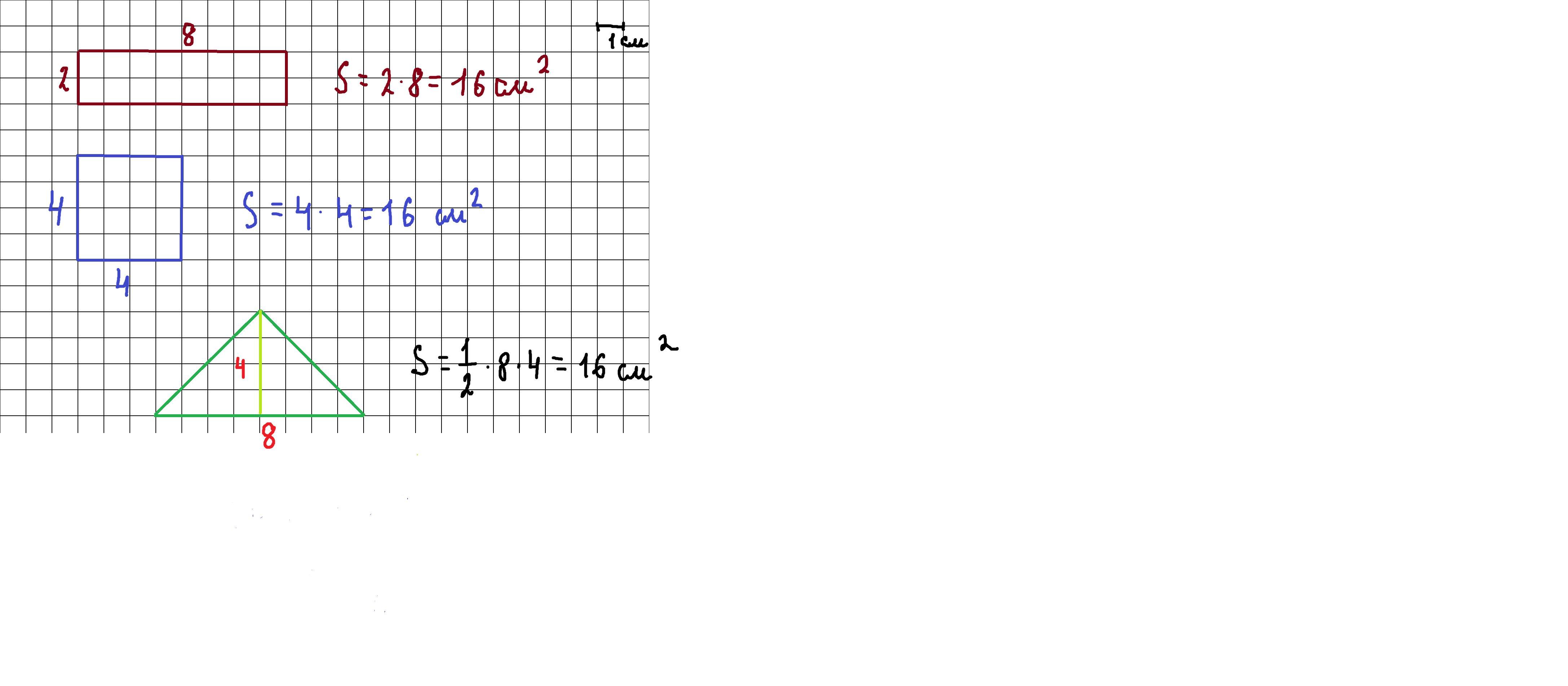 Нарисованные прямоугольник,квадрат и треугольник имеют одинаковую площадь