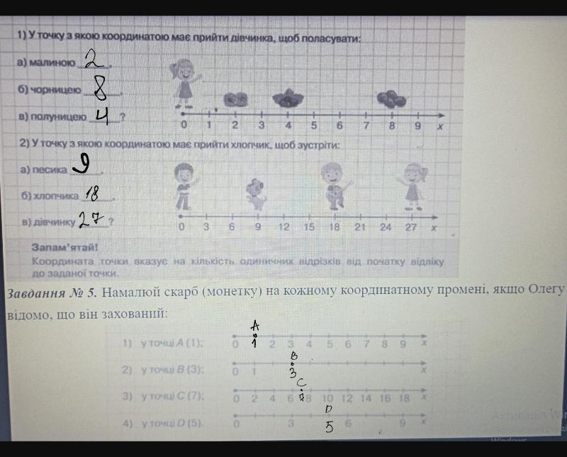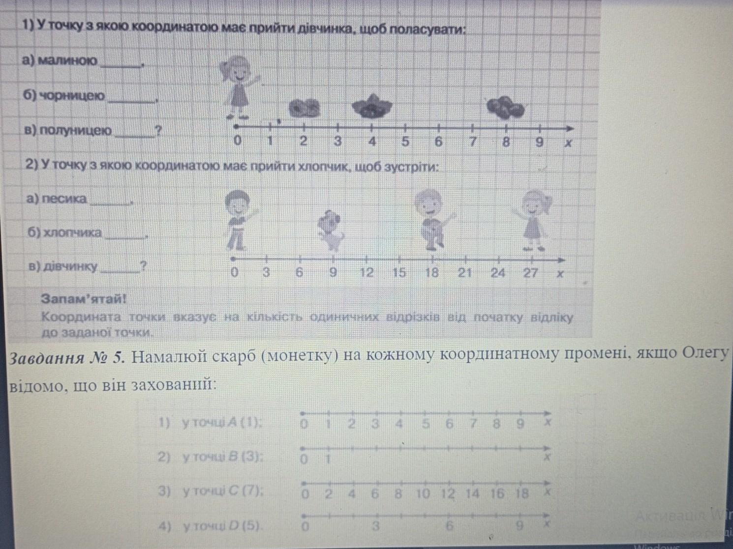 5) Намалюй скарб (монет) на кожному координатному промені, якщо Олегу відомо, що він захований:...