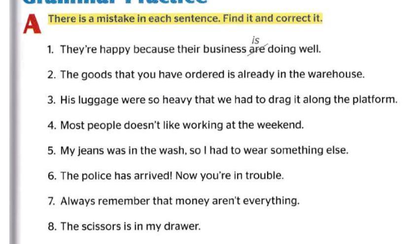 There is a mistake in each sentence. Find it and correct it. 1. They're happy because their business are doing well. 2. The goods that you have ordered is already in the warehouse. 3. His luggage were so heavy that we had to drag it along the platform. 4. Most people doesn't like working at the weekend. 5. My jeans was in the wash, so I had to wear something else. 6. The police has arrived! Now you're in trouble. 7. Always remember that money aren't everything. 8. The scissors is in my drawer.