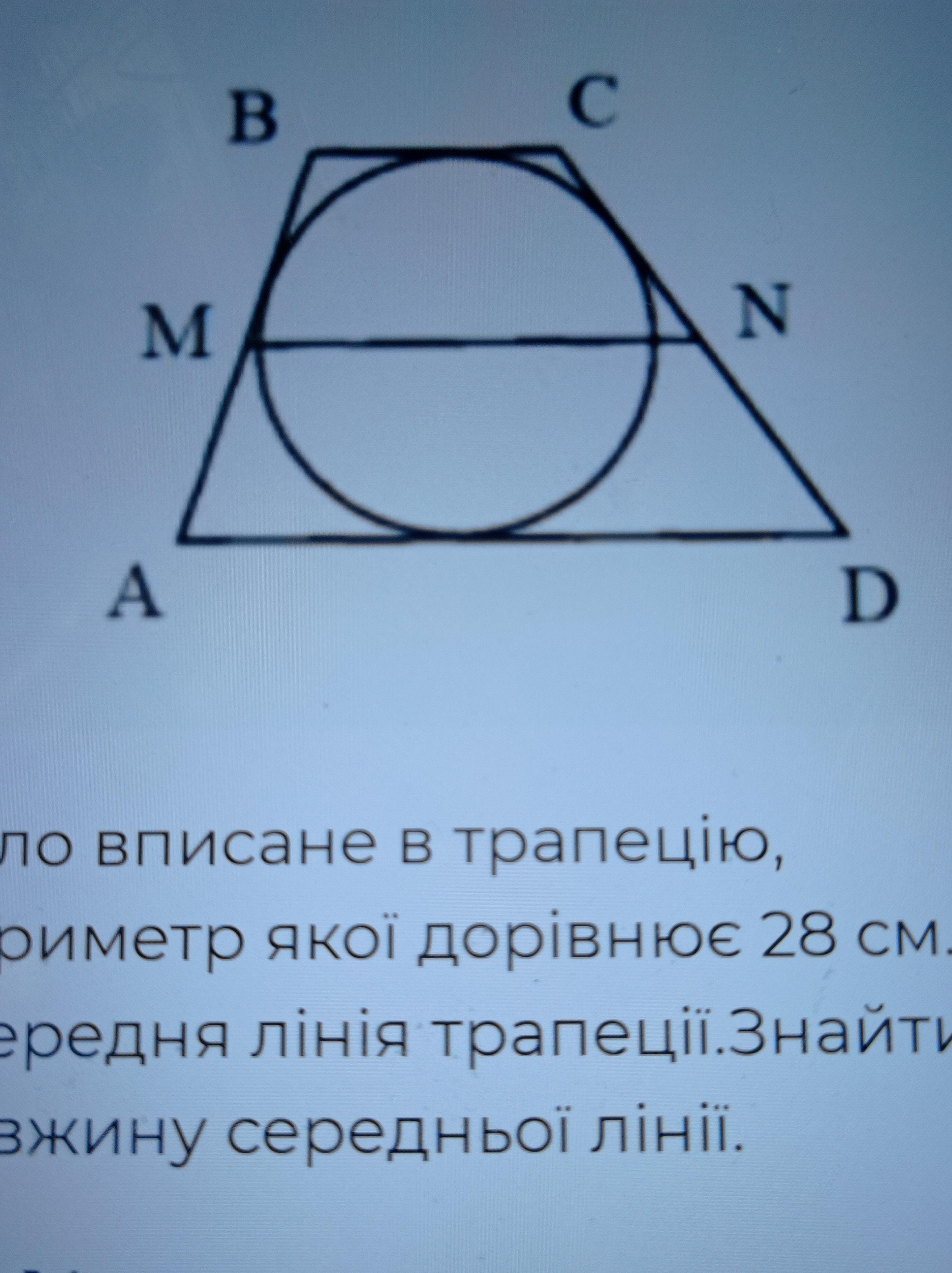 коло вписане в трапецію периметр якої лорівнює 28 см mn середня лінія трапеції знайти довжину середньої лінії