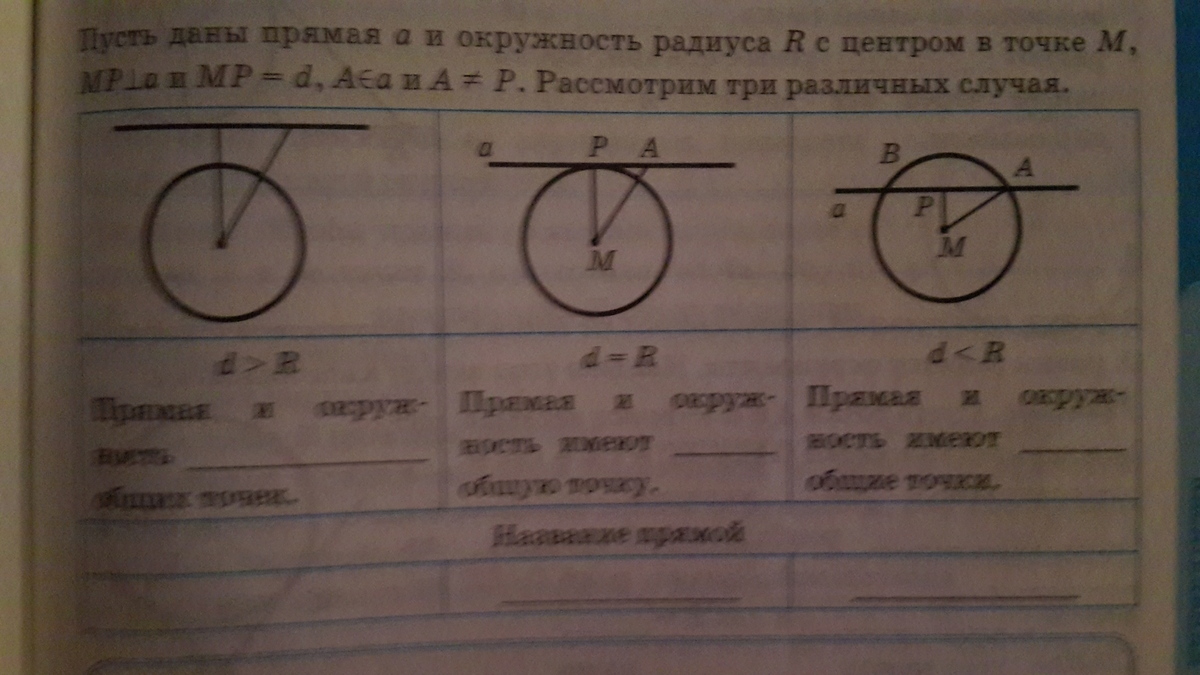 в первом случае не имеют общих точек,во-втором случае одна общая точка,а в третьем случае 2 общие точки.а под названием прямых ,в первом случае это просто прямая.во втором случае касательная,и в третьем секущая