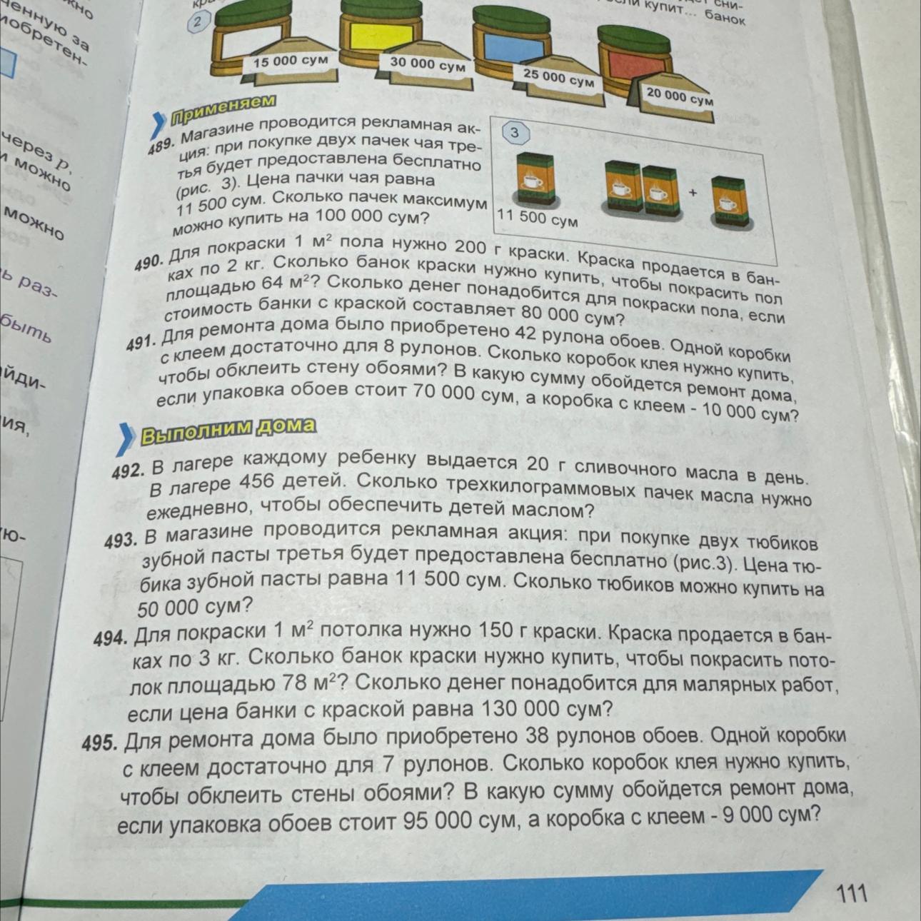 493. Магазине проводится рекламная акция: при покупке двух тюбиков зубной пасты третья будет предоставлена бесплатно. Цена тюбика зубной пасты равна 11 500 сум. Сколько тюбиков можно купить на 50 000 сум?