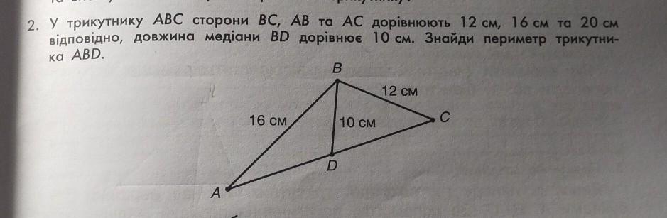 у трикутнику ABC сторони BC, AB Tа AC дорiвнюють 12 см, 16 см та 20 см вiдповiдно, довжина медіани BD дорівнює 10 см. Знайди периметр трикутни- ка ABD. в