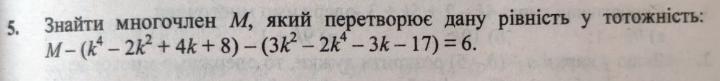 + 3k²- 2k⁴- 3k - 17 + 6 = - k⁴ + k² + k - 3 . Отже , M = - k⁴ + k² + k - 3 .