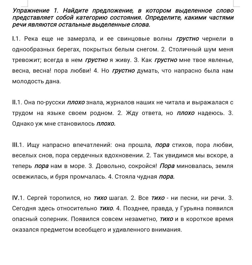 Упражнение 1. Найдите предложение, в котором выделенное слово представляет собой категорию состояния. Определите, какими частями речи являются остальные выделенные слова. 1.1. Река еще не замерзла, и ее свинцовые волны грустно чернели в однообразных берегах, покрытых белым снегом. 2. Столичный шум меня тревожит; всегда в нем грустно я живу. 3. Как грустно мне твое явленье, весна, весна! пора любви! 4. Но грустно думать, что напрасно была нам молодость дана. II.1. Она по-русски плохо знала, журналов наших не читала и выражалася с трудом на языке своем родном. 2. Жду ответа, но плохо надеюсь. 3. Однако уж мне становилось плохо. III.1. Ищу напрасно впечатлений: она прошла, пора стихов, пора любви, веселых снов, пора сердечных вдохновении. 2. Так увидимся мы вскоре, а теперь пора нам в море. 3. Довольно, сокройся! Пора миновалась, земля освежилась, и буря промчалась. 4. Стояла чудная пора. IV.1. Сергей торопился, но тихо шагал. 2. Все тихо - ни песни, ни речи. 3. Сегодня здесь относительно тихо. 4. Позднее, правда, у Гурьяна появился опасный соперник. Появился совсем незаметно, тихо и в короткое время оказался предметом всеобщего и удивленного внимания.