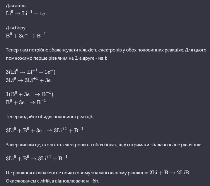 Скласти рівняння реакції та урівняти його методом електронного балансу, визначити окисник і відновник Li + B =