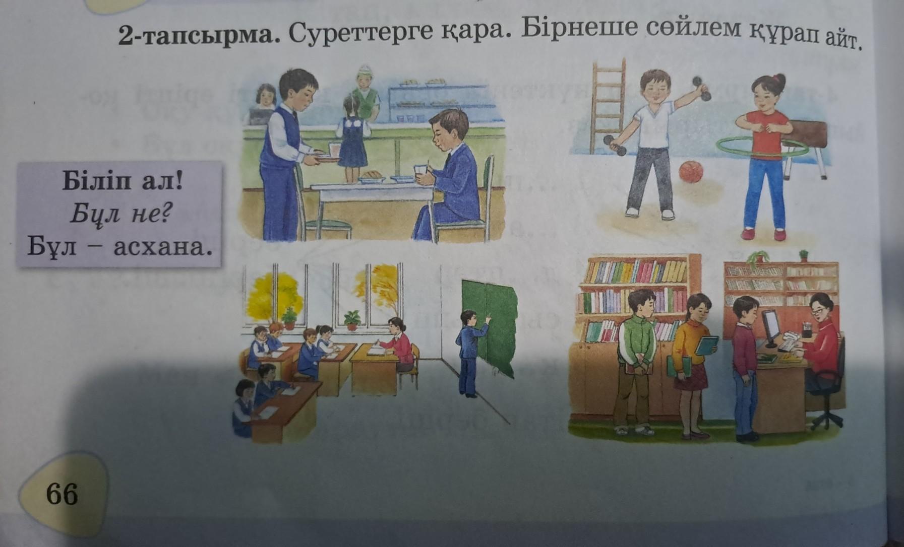 Айтайық 2-тапсырма. Суреттерге қара. Бірнеше сөйлем құрап айт. Бiлiп ал! Бул не? ул - асхана.