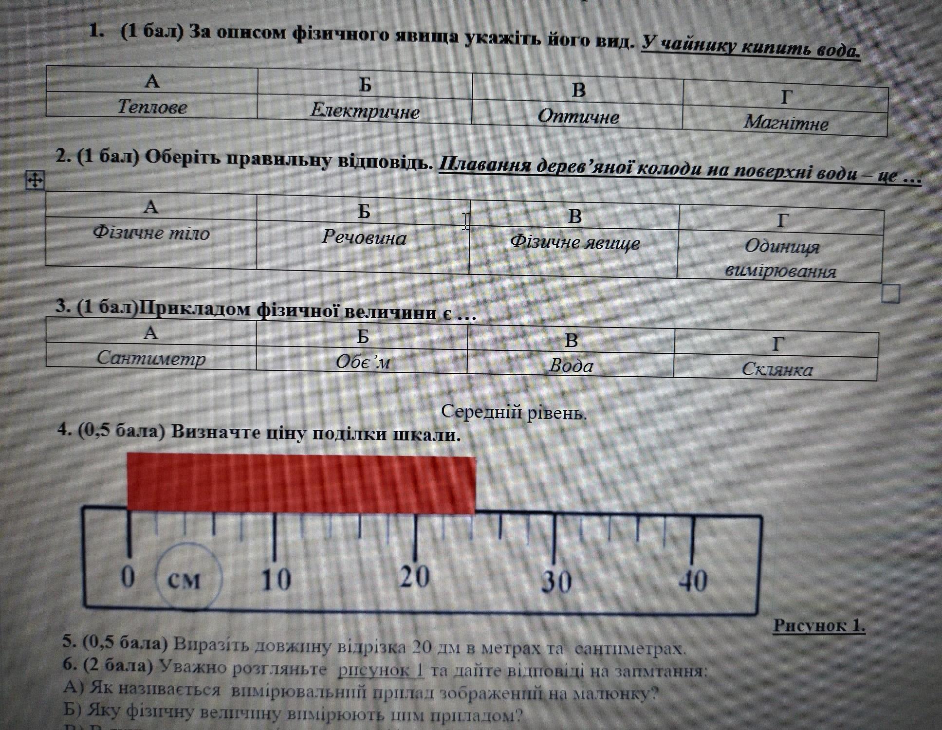 1. (1 бал) За описом фізичного явища укажiть його вид. У чайнику кипить вода. А Теплове B Г Оптичне Магнітне 2. (1 бал) Оберіть правильну відповідь. Плавання дерев'яноï колоди на поверхні води - це ... A Фізичне тіло Б Електричне Б Речовина 3. (1 бал)Прикладом фізичноï величини є ... A Сантиметр Б Обе м B Фізичне явище В Вода Г Одиниця вимірювання Г Склянка