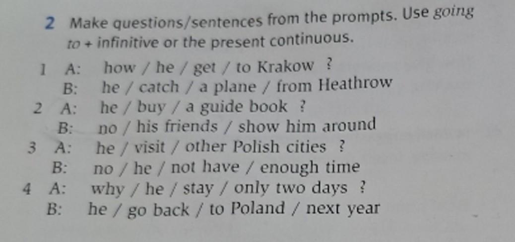 1 How is he going to get to Krakow? He is going to catch a plane from Heathrow 2 Is he going to buy a guide book? No, he isn't. his friends are showing him around 3 по аналогии со 2 4 why is he going to stay only two days? He is going back to Poland next year