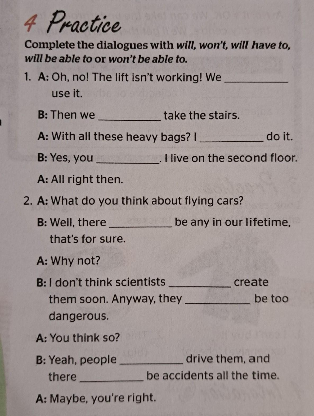 1. A: Oh, no! The lift isn't working! We **will have to** use it.