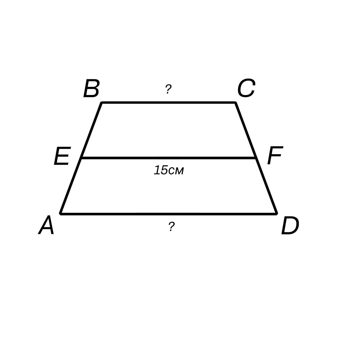 . Середня лінія трапеції дорівнює 15 см. Знай- діть основи трапеції, якщо одна з них удвічі більша за іншу.
