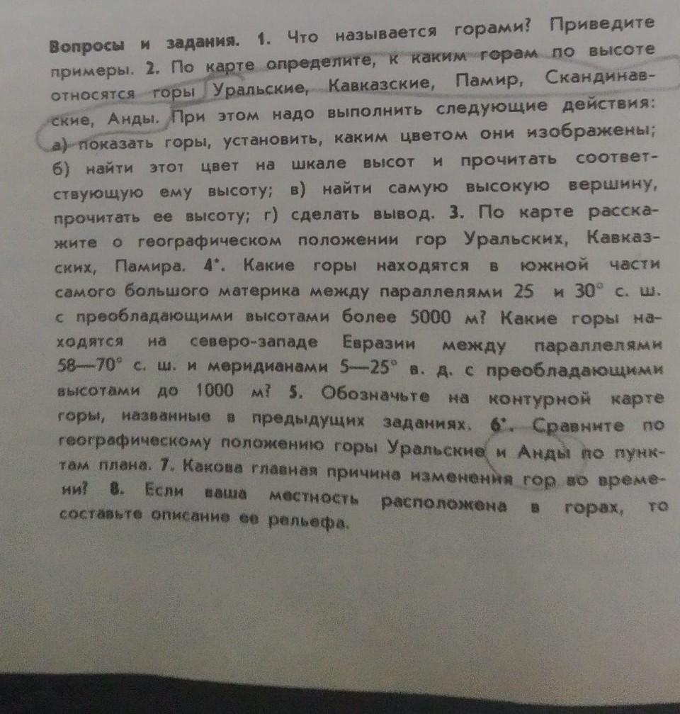 Вопросы и задания. 1. Что называется гора примеры. 2. По карте определите, к каким горам по высоте Скандинав- относятся горы Уральские, Кавказские, Памир, ские, Анды. При этом надо выполнить следующие действия: а) показать горы, установить, каким цветом они изображены; б) найти этот цвет на шкале высот и прочитать соответ- ствующую ему высоту; в) найти самую высокую вершину, прочитать ее высоту; г) сделать вывод. 3. По карте расска- о географическом положении гор Уральских, Кавказ- ских, Памира. 4. Какие горы находятся в южной части самого большого материка между параллелями 25 и 30° с. ш. с преобладающими высотами более 5000 м? Какие горы на- Евразии между ходятся на северо-западе параллелями 58-70° с. ш. и меридианами 5-25° в. д. с преобладающими высотами до 1000 м? 5. Обозначьте на на контурной карте горы, названные в предыдущих заданиях. в предыдущих заданиях. 6. Сравните по географическому положению горы Уральские и Анды по пунк- там плана. 7. Какова главная причина изменения гор во време- ни? 8. Если ваша местность расположена в горах, то составьте описание ее рельефа.